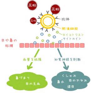 情報を受け取った肥満細胞はヒスタミンやロイコトリエンという化学伝達物質を出します。このヒスタミンやロイコトリエンが鼻や目の神経で働くと、花粉症特有の症状がでてくるのです。