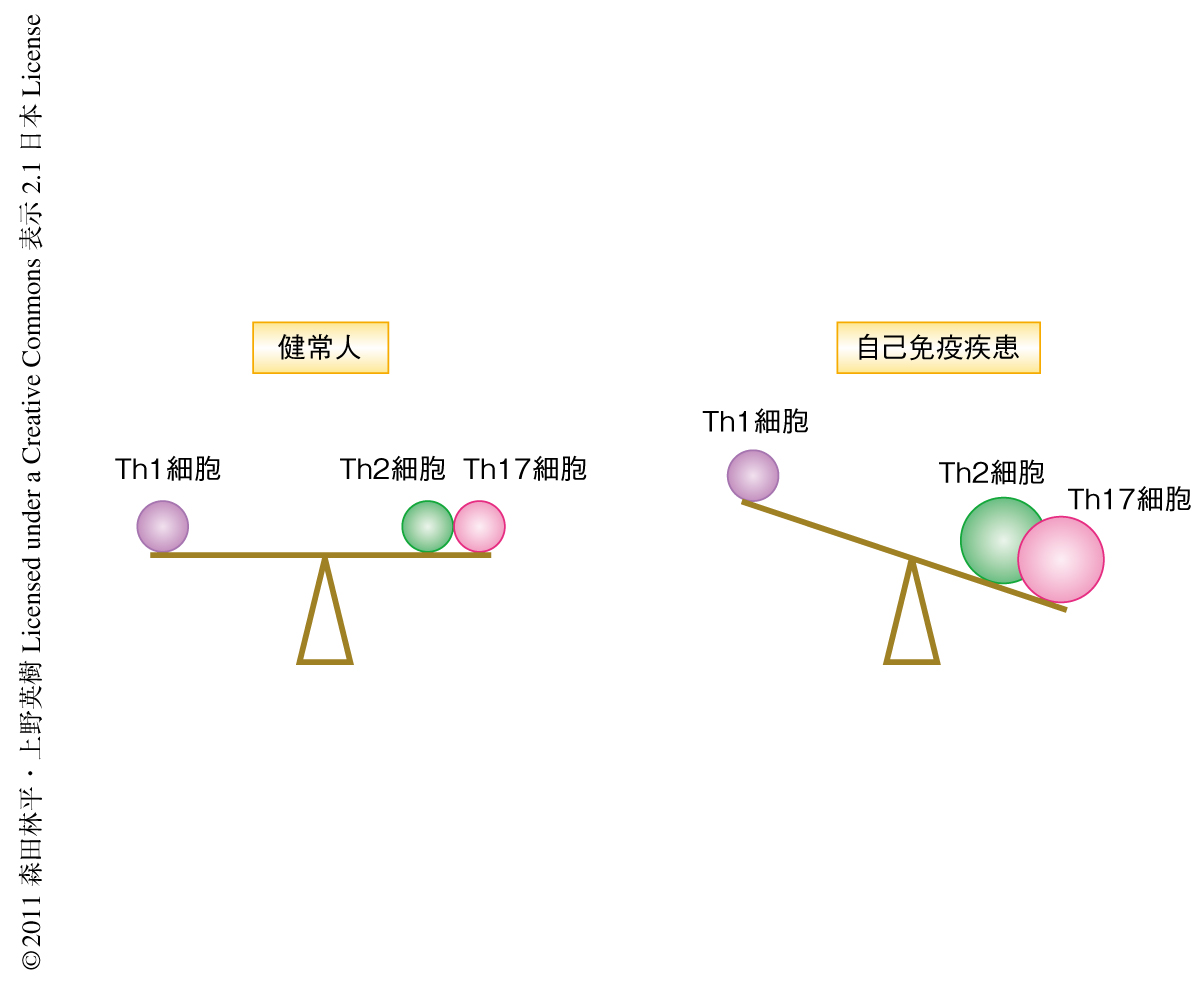 この2つのリンパ球はシーソーのような関係で、Th1が多いとTh2が少なく、Th2が多いとTh1は少なくなることがわかっています。花粉症などのアレルギーが起きるときは